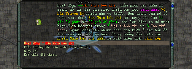 Nhằm giúp các nhân sỹ giang hồ tìm lại cảm giác phiêu bạc nhiều năm về trước của thế giới Võ lâm, bổn trang chủ sẽ tổ chức hoạt động săn nhím béo phì cho quý nhân sỹ tìm lại cảm giác "ngày xưa ấy!".